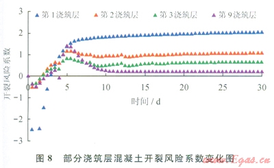 根據(jù)溫度應(yīng)力預(yù)測和判斷混凝土是否發(fā)生開裂,采用開裂風(fēng)險系數(shù)評估,一般認(rèn)為當(dāng)開裂風(fēng)險系數(shù)達(dá)到0.7時,混凝土開裂的可能性已經(jīng)很大。