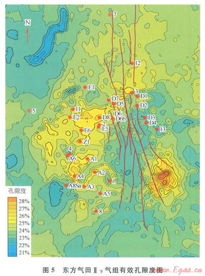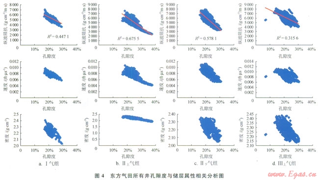 在進行儲層孔隙度橫向描述之前,需要進行了大量的儲層物性研究工作。研究的目的是通過分析儲層物性和與地震資料有直接關(guān)系的儲層的速度、密度和波阻抗等地震屬性的相關(guān)關(guān)系,來建立起合理的井震關(guān)系[14]。中海石油(中國)有限公司湛江分公司西部東方氣田各氣組單井孔隙度與地震的波阻抗、速度和密度都有一定的相關(guān)性。圖4為東方氣田多井分氣組進行的孔隙度與地震的波阻抗、速度和密度的相關(guān)分析結(jié)果,從圖4上可以看出各氣組儲層的孔隙度與這幾種地震屬性有較好的相關(guān)關(guān)系,其中Ⅱ上氣組孔隙度和波阻抗的相關(guān)關(guān)系高達0.82,這說明東方氣田儲層的孔隙度與地震屬性有較好的相關(guān)性。因此,可以利用與地震屬性的相關(guān)性預測儲層孔隙度的方法來描述孔隙度的橫向變化。通過抽井檢驗和儲量對比等方式檢查認為各個氣組的孔隙度預測結(jié)果均為合理結(jié)果(圖5)。