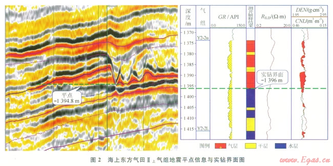 研究表明,在一定的地質(zhì)條件下砂體含氣后在地震資料上表現(xiàn)為明顯的“亮點”效應(yīng),氣層的振幅異常能較好地反映砂體的含氣情況川。在鶯歌海盆地的多個淺層氣藏實際鉆井資料證實,鉆在振幅“亮點”范圍內(nèi)的井,其目的層均含氣。低部位如受氣水界面控制,同一種地震屬性在氣水邊界之上和之下表現(xiàn)出來的響應(yīng)有很大差異,形成“平點”現(xiàn)象,根據(jù)該平點信息可確定氣水界面。測井解釋結(jié)果也證實該界面是可靠的。如圖2所示,東方氣田的Ⅱ上氣組,根據(jù)平點信息確定的氣水界面為海拔-1394.6m,根據(jù)該界面圈定的含氣范圍內(nèi)有明顯的“亮點效應(yīng)”,實際井鉆遇的氣水界面為海拔-1396.0m,證實在該區(qū)域可以依據(jù)三維地震資料的亮點效應(yīng)和平點現(xiàn)象來確定氣水界面,從而確定氣田的含氣面積。該方法可以應(yīng)用在沒有實鉆界面的其他氣組或鄰近相似氣田,來彌補海上氣田鉆井工作量相對少引起資料不足的缺陷。