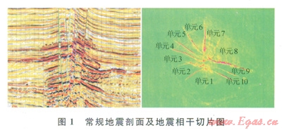 要確保儲量計算結(jié)果的精度,就必須從縱向上、平面上對儲量計算單元進行細分。地震相十體技術(shù)能夠幫助更好地識別斷層,有助于合理、精細劃分儲量計算單元,該項技術(shù)利用地震信號相干值的變化來描述地層、巖性等的橫向非均勻性,有利于研究斷層、微斷裂的空間分布,地質(zhì)構(gòu)造異常及巖性的整體空間展布特征[9]。地震波同相軸發(fā)生錯動或波形橫向變化,都使相干數(shù)值發(fā)牛明顯變化,在相干切片上可直觀顯示斷層,從而確定平面上的儲量計算單元,并結(jié)合鉆井情況和地質(zhì)認識確定各單元的儲量級別[10]。圖1是海上樂東15氣田常規(guī)地震剖面及地震相干切片圖,根據(jù)其對斷層的識別,共劃分了10個計算單元,探、評價井信息表明,各計算單元氣體組分差異大,相干體技術(shù)識別斷層后可以更加細分儲量計算單元,根據(jù)各計算單元的氣體組分、儲量的不同,從而在開發(fā)實施的過程中優(yōu)化開發(fā)井井位,優(yōu)先開發(fā)純烴含量高的計算單元,針對儲量大的區(qū)塊合理部署開發(fā)井數(shù),為高效、合理地利用天然氣資源奠定了基礎(chǔ)。