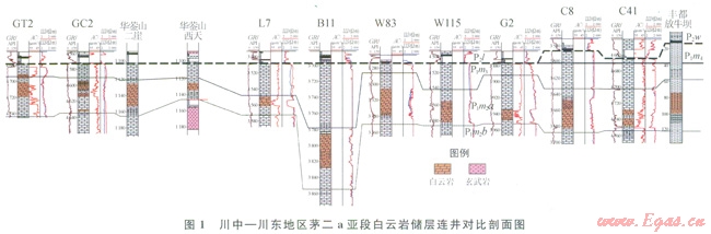 對(duì)川東、川中地區(qū)鉆揭中二疊統(tǒng)鉆井的鉆錄井資料重新梳理,系統(tǒng)研究巖心、巖屑、電測(cè)資料,并對(duì)中二疊統(tǒng)野外露頭剖面(華鎣山二崖剖面、西天剖面、李子埡剖面,豐都暨龍鎮(zhèn)烏羊壩剖面、放牛壩剖面,豐都武平大壩剖面)進(jìn)行仔細(xì)觀(guān)測(cè),筆者發(fā)現(xiàn)[2],川東中局部地區(qū)中二疊統(tǒng)茅口組茅二a亞段內(nèi)發(fā)育一套最厚為30m的白云巖、硅質(zhì)白云巖儲(chǔ)層(1)