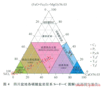 方維萱[7]提出SF—C圖解。C端元(CaO)代表正常海水的沉積作用形成的碳酸鹽巖,S端元(SiO2)代表以SiO2為酸酐的熱水同生沉積作用形成的硅質(zhì)巖,F端元(FeO+Fe2O3+MgO)代表富Fe、Mg碳酸鹽型熱水同生沉積作用形成的菱鐵礦巖。川東地區(qū)所有中二疊統(tǒng)層狀硅質(zhì)巖、硅質(zhì)白云巖、白云巖樣品均落在硅質(zhì)鐵白云巖(典型的熱水混合同生沉積區(qū))、硅質(zhì)巖(SiO2酸酐型熱水同生沉積區(qū))及鐵白云質(zhì)硅質(zhì)巖(過(guò)渡區(qū))內(nèi),而四川盆地石炭系、長(zhǎng)興組、飛仙關(guān)組、嘉陵江組和雷口坡組的樣品則落在正常海水沉積區(qū)(4)S—F—C圖解顯示中二疊統(tǒng)層狀硅質(zhì)巖、白云巖、硅質(zhì)白云巖成因與其他層系的白云巖成因截然不同,為熱水成因。