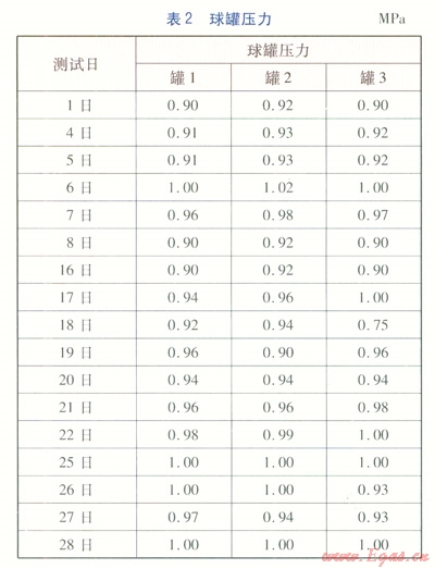 儲氣溫度與壓力是影響球罐內(nèi)鼙腐蝕的環(huán)境因素[2]。球罐儲氣溫度為-10~60℃。2013年2月各測試日3臺球罐的壓力(10:00的數(shù)據(jù))見表2。由表2可知,罐l~3壓力范圍分別為0.90~1.00、0.90~1.02、0.75~1.00MPa。通常,設(shè)計壓力為運(yùn)行壓力的l.2倍,因此在壓力實驗時選取1.2 MPa作為實驗壓力。各項實驗中選取的基材材質(zhì)與球罐罐體內(nèi)壁材質(zhì)一致,涂層平均厚度為175mm。