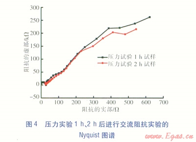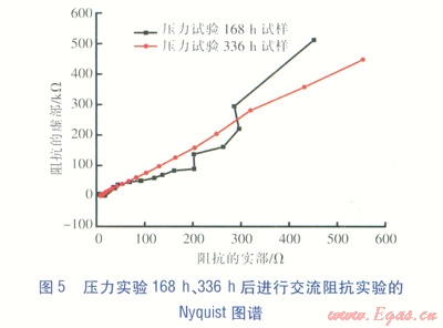 實驗?zāi)康氖菧y試涂層對基材的保護(hù)能力。交流阻抗實驗選用的儀器為電化學(xué)測試用PARSTAT2273電化學(xué)工作站,采用經(jīng)典一三電極體系:參比電極為飽和甘汞電極(SCE),輔助電極為鉑電極,帶涂層的基材為工作電極。分別對實驗時間為1h、2h、168h、336h的壓力實驗試件進(jìn)行交流阻抗實驗[3],實驗數(shù)據(jù)采用ZsimpWin軟件擬合,并擬合出Nyquist圖譜(見圖4、5)。圖4、5并未出現(xiàn)文獻(xiàn)[4]提供的曲線形態(tài)(該曲線形態(tài)表征腐蝕物穿透涂層,對基材造成損害)可得到以下結(jié)論:涂層有效阻擋了天然氣腐蝕性物質(zhì)向基材的擴(kuò)散。