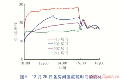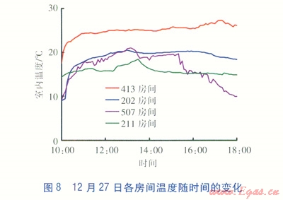 由此可見(jiàn),在正常晴朗天氣下,llO0l800,不啟動(dòng)風(fēng)機(jī)盤管,僅依靠太陽(yáng)能輻射取暖基本可滿足供暖需求。當(dāng)遇到陰雨天氣時(shí),室內(nèi)溫度急劇下降,需開(kāi)啟供暖設(shè)施。