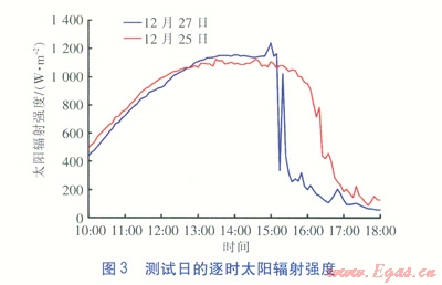 筆者采用江億提出的隨機(jī)氣象模型[2],模擬計(jì)算測(cè)試日逐時(shí)太陽(yáng)輻射強(qiáng)度。模型考慮了天氣變化對(duì)太陽(yáng)輻射強(qiáng)度的影響,通過(guò)判定得出逐時(shí)天氣狀況,針對(duì)不同天氣情況采用相應(yīng)的模型確定太陽(yáng)輻射強(qiáng)度。l225日為全天晴朗的天氣,l227日為晴轉(zhuǎn)陰的天氣,兩日的逐時(shí)太陽(yáng)輻射強(qiáng)度見(jiàn)圖3。由圖3可知,1225日最大太陽(yáng)輻射強(qiáng)度出現(xiàn)在1459,為l238Wm2。1227日最大輻射強(qiáng)度出現(xiàn)在1333,為l238Wm2。兩日出現(xiàn)最大太陽(yáng)輻射強(qiáng)度的區(qū)間在1300—1500