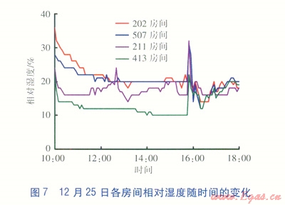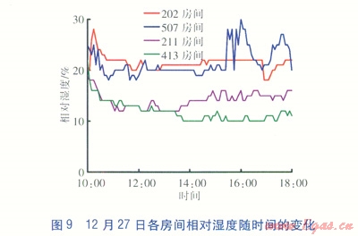 122710O0室內(nèi)溫度為9.05℃,l3O0左右溫度持續(xù)在20℃左右,l630以后室內(nèi)溫度逐漸下降,l800室內(nèi)溫度為18.31℃。相對(duì)濕度基本在25%以下。