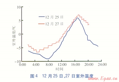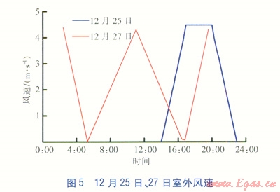 1225日、27日逐時(shí)室外溫度、風(fēng)速分別見(jiàn)圖4、5。由圖4、5可知,測(cè)試日室外溫度變化趨勢(shì)基本一致。最高室外溫度均出現(xiàn)在1640左右,25日、27日最高室外溫度分別為5.96.6℃。日最低室外溫度基本出現(xiàn)在800前后,25日、27日最低室外溫度分別為-9.07、-8.03℃2514O0之后開(kāi)始起風(fēng),風(fēng)速在1600左右升至4.5ms27日全天風(fēng)速變化范圍04.5ms。由實(shí)測(cè)結(jié)果可知,25日、27日室外空氣相對(duì)濕度變化范圍分別為6.04%~24.26%、5.52%~19.38%。
