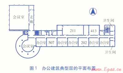 選擇4個(gè)房間(位置見(jiàn)圖l)進(jìn)行室內(nèi)熱環(huán)境監(jiān)測(cè),被測(cè)房間分別為:南向202507房間,建筑面積均為64m2;北向211、413房間,建筑面積分別為124、64m2。規(guī)定507房間不開(kāi)啟風(fēng)機(jī)盤管,其他房間均可開(kāi)啟風(fēng)機(jī)盤管供暖。