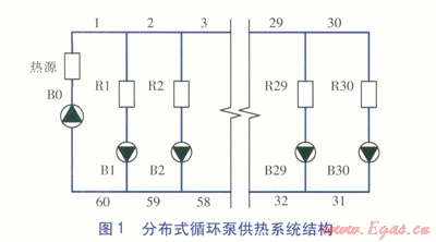 傳統(tǒng)供熱方式(動力集中式)是在熱源處設(shè)置質(zhì)量流量、揚(yáng)程均能滿足整個(gè)供熱系統(tǒng)的循環(huán)泵,循環(huán)泵揚(yáng)程應(yīng)滿足最不利用戶資用壓頭的需求。這往往導(dǎo)致近源端用戶資用壓頭過大,遠(yuǎn)端用戶資用壓頭不足的情況,從而形成大質(zhì)量流量小溫差的運(yùn)行狀況,不利于供熱系統(tǒng)節(jié)能[1-2]。為了解決傳統(tǒng)供熱系統(tǒng)存在的以上問題,專家們提出了分布式循環(huán)泵供熱方式(動力分布式)。分布式循環(huán)泵供熱系統(tǒng)將熱水輸送動力一分為多,通過對分布式循環(huán)泵的適當(dāng)選型,為供熱系統(tǒng)提供適當(dāng)?shù)难h(huán)動力陽],不僅解決系統(tǒng)水力不平衡問題,還能有效降低熱水輸送能量浪費(fèi)的問題。本文對分布式循環(huán)泵供熱系統(tǒng)的節(jié)能影響因素進(jìn)行分析。