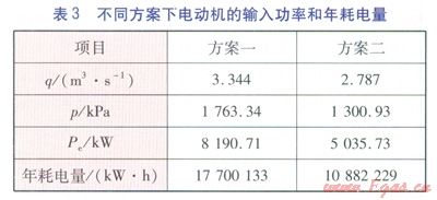 電動(dòng)機(jī)軸功率乘以年最大熱負(fù)荷利用時(shí)間即為估算的年耗電量(見表3)。由此可見,方案一要比方案二每年多消耗電能6817904kW·h,按照平均電價(jià)為0.9元/(kW·h)計(jì)算,兩個(gè)方案的電費(fèi)差額為613.61×104元/a。