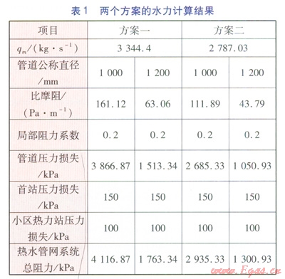 方案二中,Dt=60℃,由公式(1)可得,設(shè)計(jì)質(zhì)量流量為2787.03kg/s,查水力計(jì)算表可得,取管道公稱直徑為1000mm時(shí),管道比摩阻為111.89Pa/m,熱水管網(wǎng)系統(tǒng)總阻力為2935.33kPa,加上定壓壓力后,在沒有中繼泵站的情況下,系統(tǒng)最高壓力為3185.33kPa,大幅超過了系統(tǒng)的設(shè)計(jì)壓力,顯然是不合理的;取管道公稱直徑1200mm時(shí),比摩阻為43.79Pa/m,熱水管網(wǎng)系統(tǒng)總阻力為1300.93kPa,加上定壓壓力后,在沒有中繼泵站的情況下,系統(tǒng)最高壓力為1550.93kPa,無須設(shè)置中繼泵站即可將管道的壓力控制在設(shè)計(jì)壓力范圍之內(nèi)。