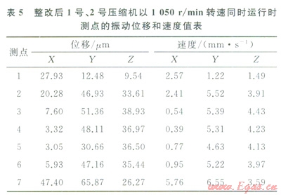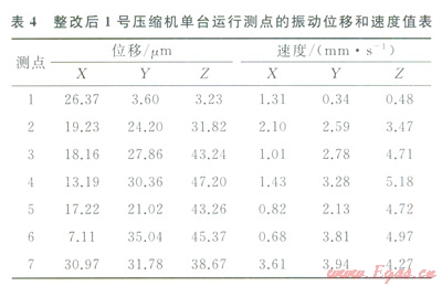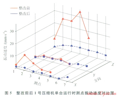 按照?qǐng)D3的整改參數(shù)完成了工藝管線的現(xiàn)場(chǎng)整改,整改前后現(xiàn)場(chǎng)如圖4所示。為評(píng)價(jià)減振理效果,完成了1號(hào)壓縮機(jī)單臺(tái)運(yùn)行和1號(hào)、2號(hào)壓縮機(jī)同時(shí)運(yùn)行兩種工況的現(xiàn)場(chǎng)測(cè)試。測(cè)點(diǎn)的布置情況如圖4所示,測(cè)點(diǎn)的方向與整改前一致,其中1號(hào)壓縮機(jī)單臺(tái)運(yùn)行參數(shù)及測(cè)點(diǎn)的振動(dòng)位移和速度值分別見表34,1號(hào)、2號(hào)壓縮機(jī)同時(shí)運(yùn)行時(shí)測(cè)點(diǎn)的振動(dòng)位移和速度值見表5,整改前后l號(hào)壓縮機(jī)單臺(tái)運(yùn)行時(shí)測(cè)點(diǎn)振動(dòng)速度對(duì)比圖如圖5所示。