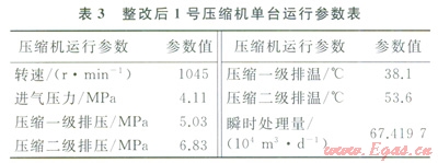 數(shù)據(jù)分析得出:由圖5知,工藝管線整改后,1號(hào)壓縮機(jī)單臺(tái)運(yùn)行時(shí)管線的振動(dòng)位移和速度大大降低,最大位移為47.2mm,最大振動(dòng)速度為5.18mms,遠(yuǎn)低于限定值;②相比1號(hào)壓縮機(jī)單臺(tái)運(yùn)行而言,1號(hào)、2號(hào)壓縮機(jī)同時(shí)運(yùn)行時(shí)工藝管線的振動(dòng)略微增加,最大位移為65.87mm,最大速度為6.55mms,但都在標(biāo)準(zhǔn)范圍之內(nèi);③1號(hào)壓縮機(jī)單臺(tái)運(yùn)行時(shí),測(cè)點(diǎn)B處的波峰壓力為4.128MPa,波谷壓力為4.115MPa,壓力不均勻度為0.3%,低于壓力脈動(dòng)限制值0.54(API 618)由于1號(hào)、2號(hào)兩臺(tái)壓縮機(jī)同時(shí)運(yùn)行時(shí),處理量達(dá)到了119.52×104m3d,增壓站的處理能力得到較大提升;⑤另外,3號(hào)、4號(hào)壓縮機(jī)共用另一匯氣管,工藝管線振動(dòng)情況與1號(hào)、2號(hào)壓縮機(jī)運(yùn)行時(shí)基本一致,管線振動(dòng)也滿足標(biāo)準(zhǔn)要求。