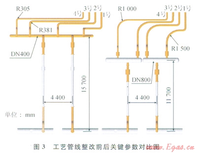結(jié)合現(xiàn)場(chǎng)實(shí)際,從消減激振力{F}、管線設(shè)計(jì)相關(guān)標(biāo)準(zhǔn)和現(xiàn)場(chǎng)操作工藝方面綜合分析,確定了如下的治理措施:①考慮設(shè)備檢修和倒流程操作,采用2個(gè)獨(dú)立的匯氣管,2個(gè)匯氣管出口分別連接到1號(hào)、2號(hào)和3號(hào)、4號(hào)壓縮機(jī);按照一般匯氣管的流通面積應(yīng)大于進(jìn)氣管流通面積總和3倍的要求,增加匯氣管直徑和緩沖容積[12];減少?gòu)濐^以及增加彎頭的曲率半徑;④縮短管線長(zhǎng)度以增加管線剛度、合理布置支承。工藝管線整改前后關(guān)鍵參數(shù)對(duì)比如圖3所示。