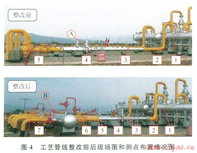 1)分析不同工況下管線的振動(dòng)速度頻譜特性以及關(guān)鍵點(diǎn)的壓力脈動(dòng)測(cè)試,得出了壓力脈動(dòng)是引起管線振動(dòng)的主要原因,其根源在于匯氣管緩沖容積太小,進(jìn)出口配置不合理,產(chǎn)生了較大的激振力,使管線受迫振動(dòng)。為了控制管道的壓力脈動(dòng),提出了增大匯氣管的緩沖容積、增加彎頭曲率半徑以及合理布置支承的治理措施。工藝管線整改完成后,測(cè)點(diǎn)的振動(dòng)明顯降低,壓力脈動(dòng)達(dá)到了要求,取得了較好的減振效果,同時(shí)也提升了增壓站的處理能力。