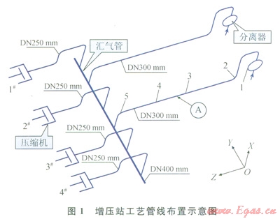 某增壓站是一座集采、集、輸、增壓功能為一體的大型集輸站,設(shè)計(jì)處理規(guī)模為183×104m3d,設(shè)計(jì)壓力為8.0MPa。壓縮機(jī)組由3臺(tái)(1號(hào)、2號(hào)、3號(hào))功率為1250kW1臺(tái)(4號(hào))功率為1030kW的大型往復(fù)式壓縮機(jī)組成,壓縮機(jī)結(jié)構(gòu)為水平對(duì)稱平衡型,采用燃?xì)獍l(fā)動(dòng)機(jī)驅(qū)動(dòng)。增壓站工藝管線布置情況如圖1所示,分離器出口管道與匯氣管連接,匯氣管出口管道與壓縮機(jī)連接。增壓站自投運(yùn)以來,壓縮機(jī)組運(yùn)行參數(shù)達(dá)到設(shè)計(jì)要求,但管道系統(tǒng)振動(dòng)異常,無(wú)法運(yùn)行多臺(tái)壓縮機(jī)組,嚴(yán)重制約生產(chǎn)產(chǎn)量。雖采取了強(qiáng)化管道支承、加固連接底座等減振措施,但減振效果不佳。