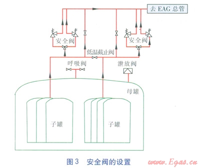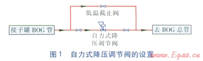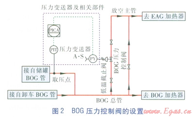 BOG壓力控制閥為氣動(dòng)式薄膜凋節(jié)閥,設(shè)置于自力式降壓調(diào)節(jié)閥后、BOG總管的支管路上,進(jìn)口與BOG總管連接,出口與放空主管連接,取壓點(diǎn)設(shè)置在BOG壓力控制閥前儲(chǔ)罐BOG管上,當(dāng)取壓點(diǎn)壓力達(dá)到設(shè)定值時(shí),閥門開啟,實(shí)現(xiàn)少量放散。BOG壓力控制閥的設(shè)置見圖2(圖2中EAG指安全放散氣體)。