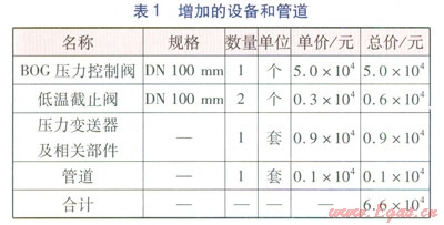 設(shè)置BOG壓力控制閥,需要增加一套BOG壓力控制系統(tǒng),即需要增加相應(yīng)的設(shè)備和管道,因此相應(yīng)的造價(jià)也要增加。增加的設(shè)備和管道見表1。