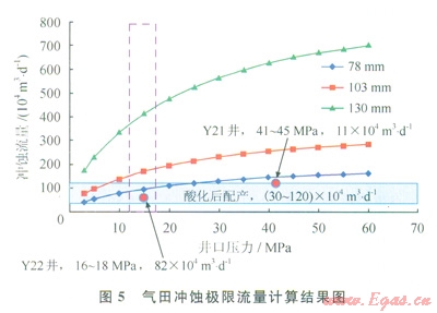 在氣田生產(chǎn)過程中,為了進一步分析產(chǎn)量過高的原因產(chǎn)生的沖蝕,開展了不同單井井口壓力和產(chǎn)量下的臨界沖蝕流量的計算。根據(jù)氣田的具體情況,井口設備的節(jié)流閥通徑分別為78mm、103mm、130mm。因此,分別計算了氣田工況范圍下的單井極限沖蝕流量。根據(jù)計算結果可以看到,將2口典型井在試氣時的工況標在計算圖(4)中,2口井均在沖蝕流量之下(5)。在氣田生產(chǎn)中,根據(jù)開發(fā)配產(chǎn),建議井口產(chǎn)氣量限制在70×10495×104m3d,少數(shù)井配產(chǎn)在100×104m3d或以上時,井口閥的尺寸要求換成100.5mm。由此確定井口采氣樹選擇如下:產(chǎn)量小于80×104m3d,主通徑(標稱尺寸)78mm;產(chǎn)量在80×104200×104m3d,主通徑為103mm;產(chǎn)量大于200×104m3d,主通徑為130mm