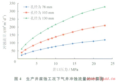 計算了不同井口壓力下不同孔徑尺寸(標稱尺寸,最小內徑)沖蝕流量(4),計算的生產(chǎn)工況范圍按照氣田的實際情況確定。根據(jù)計算,油壓為1518MPa,井口溫度為6070℃,Æ78mm節(jié)流閥抗沖蝕流量為85×104112×104m3d。氣田的產(chǎn)量最高達126×104m3d,一般井產(chǎn)量均大于85×104m3d。因此,生產(chǎn)過程中長期存在沖蝕現(xiàn)象,這是井腐蝕嚴重的重要原因之一。根據(jù)計算結果,在目前的工況下,為避免沖蝕和安全生產(chǎn),一些單井產(chǎn)量最好控制在85×104m3d以下。