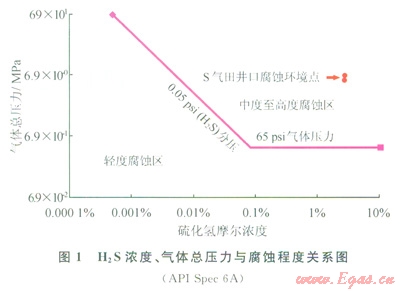 根據(jù)NACE標準H2SCO2分壓與腐蝕程度關系(1),如果H2S氣體的分壓大于0.34474kPa(0.05psi絕對壓力,1psi6.895kPa,下同),則必須使用抗硫化氫材料。根據(jù)腐蝕環(huán)境分析,氣田位于中至高度腐蝕區(qū)。氣田CO2分壓與H2S分壓之比小于200,系統(tǒng)腐蝕以H2S為主導。