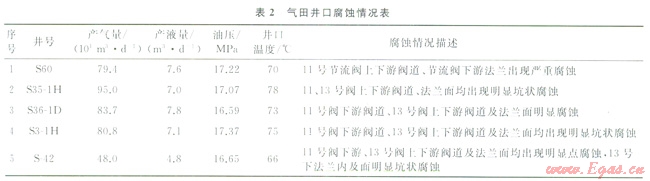 氣田正在生產(chǎn)的部分典型井具體情況見表2。井的產(chǎn)氣量從48×10495×104m3d,油壓為1618MPa,井口溫度為6678℃。腐蝕情況的主要表現(xiàn)為節(jié)流閥上下游閥道、法蘭面均出現(xiàn)明顯坑狀腐蝕。地層主要是碳酸鹽巖,生產(chǎn)過程中沒有出現(xiàn)井口固體砂粒的現(xiàn)象。從腐蝕情況來看,并不是僅有高產(chǎn)井出現(xiàn)了井口腐蝕。分析腐蝕的發(fā)生不僅與產(chǎn)量有關,顯然也與溫度和壓力有一定的關系,處于經(jīng)濟考慮而選擇的節(jié)流閥材質偏低也是原因之一。在氣田進行完井生產(chǎn)管柱設計時,對油管進行了沖蝕極限速度的校核,選擇了Æ88.9mm為主的生產(chǎn)油管。但是井口的部分節(jié)流閥尺寸小于油管尺寸,對沖蝕腐蝕沒有進行重點研究。由此推斷,腐蝕的主要因素不僅是化學腐蝕,更有可能來源于沖蝕腐蝕。因此,進行沖蝕極限速度的計算來判定腐蝕是必要的。