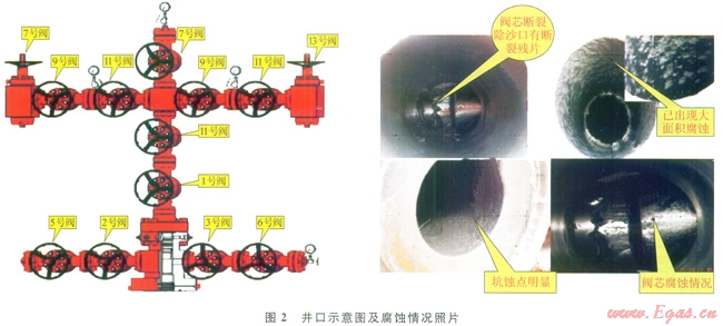 氣井井口自生產(chǎn)以來,經(jīng)觀察發(fā)現(xiàn)部分井的井口出現(xiàn)腐蝕。出現(xiàn)腐蝕的井口位置基本相似(2),一般在井口的11號和13號閥處,主要是一些坑蝕、點蝕,偶爾出現(xiàn)有閥芯斷裂的情況。節(jié)流閥的實際直徑為79.37mm77.78mm,是生產(chǎn)中經(jīng)常出現(xiàn)腐蝕的風險點。