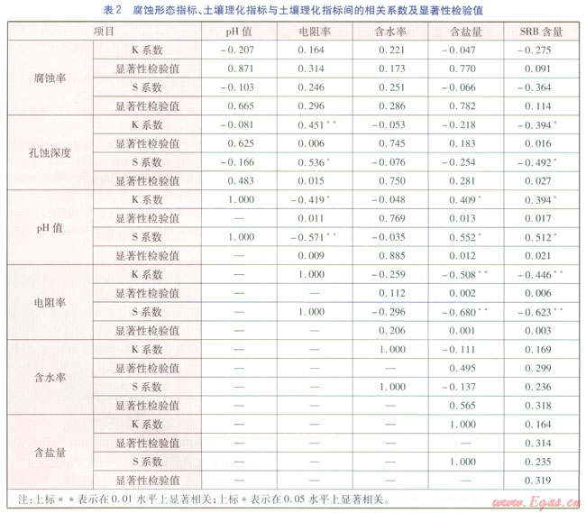 相關(guān)性分析是研究?jī)蓚€(gè)及以上變量之間相關(guān)程度以及用一定函數(shù)米表達(dá)現(xiàn)象相互關(guān)系的方法。在研究土壤腐蝕問(wèn)題,建立腐蝕模型時(shí),需確定土壤理化指標(biāo)對(duì)金屬腐蝕程度的影響程度(或相關(guān)性),并將那些對(duì)土壤腐蝕性影響較大的理化指標(biāo)都包含在腐蝕模型中,才能準(zhǔn)確地對(duì)土壤腐蝕性評(píng)價(jià)和管道防腐措施進(jìn)行指導(dǎo)。
