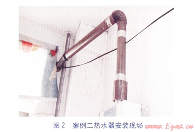 事故燃氣熱水器排氣管安裝不符合GB 6932—2001《家用燃氣快速熱水器》附錄A《家用燃氣快速熱水器安裝技術(shù)要求》A4.1.3中防倒風罩以上的排氣管室內(nèi)垂直部分不得小于250mm以及排氣管頂端必須安裝有效的防風、雨、雪的風帽的要求。此種情況下,極易出現(xiàn)在使用熱水器時,由于煙道排氣不暢,甚至出現(xiàn)倒風,致使燃氣燃燒產(chǎn)生的煙氣不能有效排到室外。