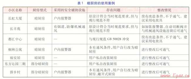 暗廚房又稱(chēng)內(nèi)廚房,指無(wú)直通室外的門(mén)或窗的廚房。這類(lèi)廚房的產(chǎn)生既有歷史的原因,又有客觀現(xiàn)實(shí)的需要。20世紀(jì)60年代至80年代早期,當(dāng)時(shí)居民生活水平低,住房面積??;建設(shè)單位缺乏設(shè)計(jì)經(jīng)驗(yàn),同時(shí)考慮到降低成本,因此,出現(xiàn)了一些暗廚房的住宅。另外,在20世紀(jì)80年代、90年代,我國(guó)建設(shè)了大批的公共福利住房,由于當(dāng)時(shí)為了解決更多人的住房問(wèn)題,也形成了暗廚房。在新建的建筑物中也存在暗廚房,如部分公共建筑因外觀幕墻的限制而不能大量開(kāi)窗,民用建筑中改造房(大戶型改為小戶型)的部分戶型不具備開(kāi)窗條件,公寓式住房、酒店式商務(wù)房的結(jié)構(gòu)條件限制等。某燃?xì)饧瘓F(tuán)公司在調(diào)查燃?xì)庥脩羰褂们闆r時(shí)發(fā)現(xiàn)的一些具有典型特征的暗廚房的使用案例,具有一定的代表性,見(jiàn)表1。在這些典型案例中大部分通過(guò)整改或采取各種安全措施后,居民用戶能夠安全使用燃?xì)狻?span lang="EN-US">
