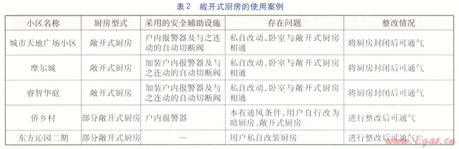 據(jù)不完全統(tǒng)計(jì),在當(dāng)今時(shí)尚裝修中敞開(kāi)式廚房的比例約為10%~20%,且有逐漸上升的趨勢(shì),特別是北京、上海等地區(qū),敞開(kāi)式廚房的理念已經(jīng)開(kāi)始在人們的心頭生根發(fā)芽。在中國(guó)傳統(tǒng)的飲食習(xí)慣條件下,敞開(kāi)式廚房存在著油煙難以排凈、清理衛(wèi)生不方便等問(wèn)題。但是在生活習(xí)慣西方化的人群中卻得到了很大程度的認(rèn)同,目前接受這一理念的主要是追求時(shí)尚、講究生活品質(zhì)的丁克家庭、單身人士,或者夫妻雙方都是非常忙碌很少在家中做飯的職場(chǎng)中人。這一新潮流從燃?xì)獍踩膶?zhuān)業(yè)角度來(lái)說(shuō)存在著很多安全隱患,并與現(xiàn)有的相關(guān)規(guī)定矛盾,因此在燃?xì)夤芾碇薪?jīng)常與私改房屋用途的居民在供氣點(diǎn)火時(shí)發(fā)生沖突。例如南方某城市在燃?xì)夤芾磉^(guò)程中遇到了相當(dāng)一部分敞開(kāi)式廚房,見(jiàn)表2