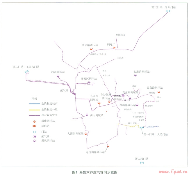 烏魯木齊城市燃?xì)夤芫W(wǎng)經(jīng)過十幾年的規(guī)劃、改造、建設(shè),形成了現(xiàn)在的燃?xì)饩W(wǎng)絡(luò)(圖1),烏魯術(shù)齊市天然氣覆蓋區(qū)域逐漸從以天、沙、新、水、米東5個主城區(qū)為主,延伸至頭屯河區(qū)、達(dá)坂城等城郊區(qū)域,已全面實(shí)現(xiàn)氣化目標(biāo),成為首個率先實(shí)現(xiàn)全面“氣化”的省會城市。