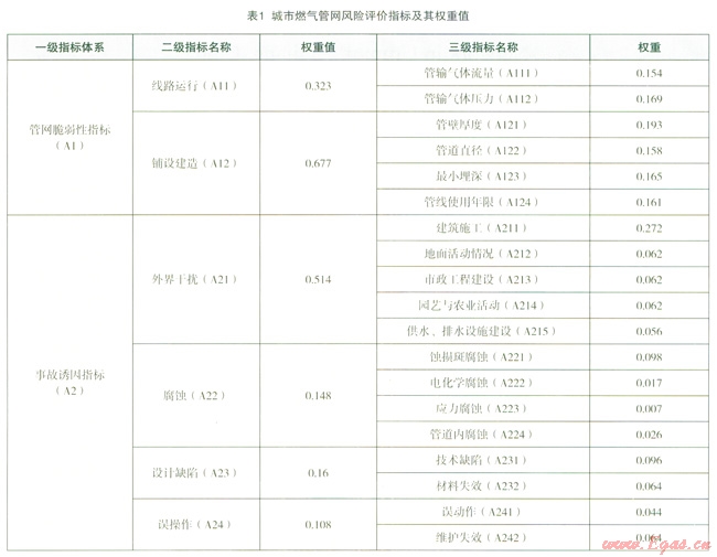 城市管網(wǎng)風(fēng)險(xiǎn)因素間權(quán)重的選擇,參考國內(nèi)外經(jīng)驗(yàn)[6],[8],各指標(biāo)權(quán)重分配見表1。