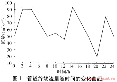 初始條件:初始時刻(t=0)管道終端(x=L)流量qv(L,0)=50m3/s。邊界條件:管道首端(x=0)壓力p(0,t)=4MPa。管道終端流量隨時間變化函數(shù)qv(L,t)=f(t),具體見圖1。