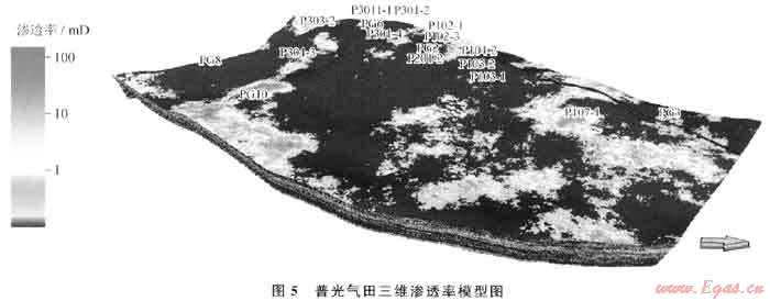 當(dāng)滲透率模型用孔隙度計(jì)算出來以后,再用裂縫指數(shù)模型作為第2個(gè)變量加權(quán)校正,使?jié)B透率模型比較好地反映裂縫的影響。從最終滲透率模型(圖5)來看,其整體的數(shù)據(jù)分布特征與孔隙度模型有一定的相似性,同時(shí)又反映了各層面不同孔隙結(jié)構(gòu)類型的滲透率變化特征,在預(yù)測有裂縫發(fā)育的部位表現(xiàn)出高滲區(qū)沿裂縫呈條帶狀延伸的特點(diǎn)。