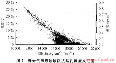 地震資料的優(yōu)勢在于能夠提供遠(yuǎn)離井點(diǎn)的儲(chǔ)集層信息.但該數(shù)據(jù)體是否能用于約束儲(chǔ)集層參數(shù)建模,還需要進(jìn)一步分析其與儲(chǔ)集層物性參數(shù)的相關(guān)性,只有兩者相關(guān)性好,方可用地震資料反演約束建模。選擇何種地震屬性作為約束條件,以及利用地震數(shù)據(jù)體對何種儲(chǔ)層參數(shù)做約束是這種建模方法中很重要的一個(gè)環(huán)節(jié)。通過分析認(rèn)為,孔隙度曲線與地震反演波阻抗之間存在良好的負(fù)相關(guān)(圖2),即高孔隙度層段通常都對應(yīng)于低波阻抗反射波,而低孔隙度層對應(yīng)于高波阻抗。