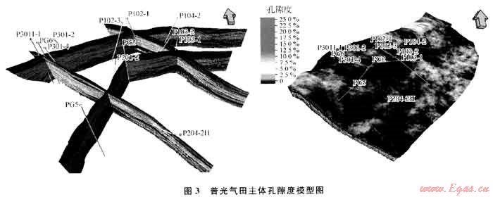 普光地區(qū)儲(chǔ)層屬于碳酸鹽巖礁灘相沉積,針對儲(chǔ)層儲(chǔ)集空間的類型多樣,儲(chǔ)層厚度大、非均質(zhì)性較強(qiáng),存在多套氣水關(guān)系等地質(zhì)特點(diǎn),綜合利用地震、測井及地質(zhì)等資料,在對儲(chǔ)層主控因素分析的基礎(chǔ)上,根據(jù)確定性建模與隨機(jī)建模相結(jié)合的原則、等時(shí)建模原則、地震數(shù)據(jù)約束建模原則,利用序貫高斯模擬法、克里金模擬法,對儲(chǔ)層物性空間分布的非均質(zhì)性進(jìn)行了細(xì)致的描述,建立普光氣田主體構(gòu)造儲(chǔ)層模型。
