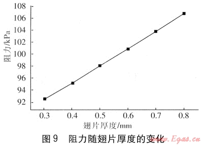 可以看出,翅片厚度對熱管的傳熱系數(shù)和傳熱量影響很小,但對阻力影響影響較大。翅片越薄,流動阻力越小。因此,應(yīng)盡可能選擇較薄的翅片。但翅片厚度的選取還要從機(jī)械強(qiáng)度、制造工藝以及耐腐蝕等方面進(jìn)行考慮。