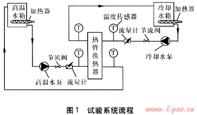 液-液熱管換熱器的試驗(yàn)裝置包括高溫水系統(tǒng)、冷卻水系統(tǒng)、數(shù)據(jù)采集系統(tǒng)。高溫水系統(tǒng)包括高溫水箱、可調(diào)功率加熱器、高溫水泵、流量調(diào)節(jié)裝置(節(jié)流閥)。冷卻水系統(tǒng)包括冷卻水箱、可調(diào)功率加熱器、冷卻水泵、流量調(diào)節(jié)裝置(節(jié)流閥)。數(shù)據(jù)采集系統(tǒng)主要包括轉(zhuǎn)子流量計、溫度傳感器。熱管換熱器的外殼為開式,可更換熱管,外殼覆蓋絕熱層,減少熱損耗,提高試驗(yàn)精度。試驗(yàn)系統(tǒng)流程見圖1。