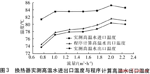 換熱器高溫水進(jìn)出口溫度與程序計算高溫水出口溫度見圖3。由圖3可知,當(dāng)高溫水流量在0.75~2.25m3/h變化時,實(shí)測的高溫水出口溫度與程序計算值的變化趨勢基本是一致的,但實(shí)測值比程序計算值低,即換熱器的實(shí)際傳熱量比程序計算的高。