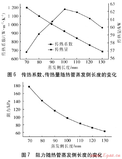 ① 在熱管總長度一定的情況下,隨著蒸發(fā)側(cè)長度增加,傳熱系數(shù)減小,但傳熱面積增加。因此,蒸發(fā)側(cè)長度的設(shè)定要綜合考慮流體的傳熱能力以及翅片對傳熱的強(qiáng)化作用,一般可以取管長的50%左右。