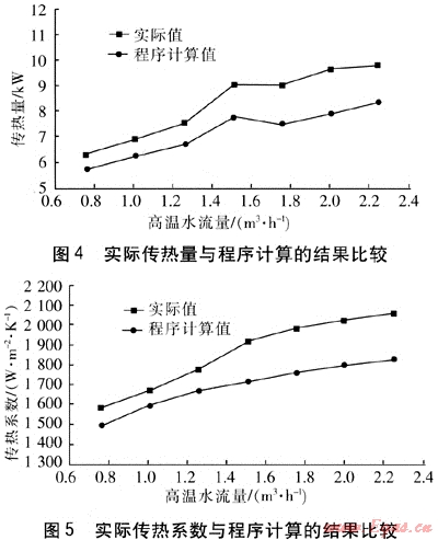 采用另外4種工況下的試驗(yàn)數(shù)據(jù)驗(yàn)證了修正后模型的精確性,對比結(jié)果表明,修正后的程序計算結(jié)果與試驗(yàn)結(jié)果基本吻合,高溫水出口溫度的最大偏差為0.2℃,是實(shí)測溫度的3.17%;傳熱量的最大偏差為0.22kW,是實(shí)測傳熱量的3.18%。