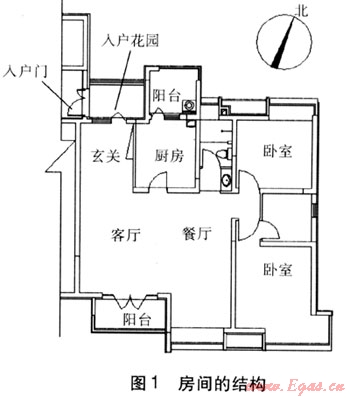 本文以某居住建筑為實例進(jìn)行分析計算,該建筑各層層高為2.9m,共13層,房間的結(jié)構(gòu)(另一側(cè)為對稱結(jié)構(gòu))見圖1。該居住建筑按照2007版的建筑節(jié)能標(biāo)準(zhǔn)設(shè)計,其設(shè)計節(jié)能率為65%,合理使用年限為50年。建筑面積為5083.2m2,建筑體積為14741.28m3,建筑表面積為4189.98m2,窗墻比分別為:南向0.45,東向0.11,西向0.11,北向0.24。