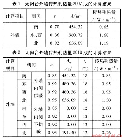 無陽臺外墻傳熱耗熱量,采用2007版的計算方法時,由式(2)得到的計算結(jié)果見表1。采用2010版的計算方法時,由式(4)得到的計算結(jié)果見表2。由表1、2可知:2010版的外墻傳熱系數(shù)修正系數(shù)大于2007版。2007版中內(nèi)側(cè)不供暖外墻不參與耗熱量計算,在內(nèi)側(cè)不供暖外墻耗熱量不參與比較時,2010版計算得到的外墻傳熱耗熱量為4.03W/m2,仍大于2007版的計算結(jié)果(3.52W/m2)。由此可知,外墻傳熱系數(shù)修正系數(shù)和供暖室內(nèi)計算溫度的選取對于外墻傳熱耗熱量的影響比較大。