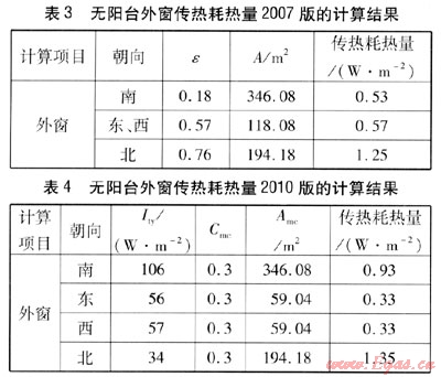 無陽臺外窗傳熱耗熱量,采用2007版的計算方法時,由式(2)得到的計算結(jié)果見表3。采用2010版的計算方法時,由式(5)、(6)得到的計算結(jié)果見表4。由表3、4可知,由2010版計算得到的計算結(jié)果大于2007版,說明2007版中無陽臺外窗傳熱耗熱量計算中采用一個綜合修正系數(shù)強(qiáng)化了太陽輻射得熱對外窗傳熱耗熱量的影響。