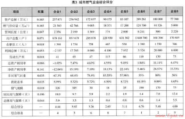 根據(jù)已經(jīng)建立的評(píng)價(jià)體系,我們對(duì)國(guó)內(nèi)12家運(yùn)營(yíng)較規(guī)范燃?xì)馄髽I(yè)進(jìn)行了調(diào)研,并從中選擇數(shù)據(jù)反饋完整的8家企業(yè)進(jìn)行比較。根據(jù)8家企業(yè)經(jīng)營(yíng)指標(biāo)(截止至2010年底)的相對(duì)優(yōu)劣,分別計(jì)算每個(gè)企業(yè)每個(gè)項(xiàng)目得分(0分-10分),各項(xiàng)加權(quán)匯總后為企業(yè)綜合得分。(見(jiàn)表3)