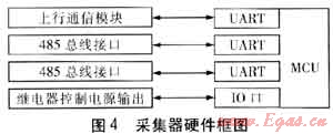 采集器的任務(wù)就是轉(zhuǎn)發(fā)集中器和燃?xì)獗碇g的通信數(shù)據(jù),并在抄讀燃?xì)獗淼臅r(shí)候短暫地給燃?xì)獗淼碾娮硬糠止╇?。采集器和集中器之間的通信采用了電力線載波通信方式。電力線載波通信有通信不穩(wěn)定、易受干擾的缺點(diǎn),但采集器只要在軟件上做些改進(jìn)就能極大地彌補(bǔ)這一缺點(diǎn),例如能短時(shí)間地儲(chǔ)存燃?xì)獗淼臄?shù)據(jù)。這樣當(dāng)給集中器返回的燃?xì)獗頂?shù)據(jù)因信道不穩(wěn)定而丟失時(shí),集中器再次下發(fā)抄這塊表的數(shù)據(jù)時(shí),采集器就不用再去抄燃?xì)獗砹耍呛芸斓刂苯臃祷夭杉鲀?chǔ)存的數(shù)據(jù),這樣就使抄表成功率大大提高。采集器也要求采用可更換的通信模塊,儲(chǔ)存容量不需要太大,采集器MCU要有至少3個(gè)UART,還要有給燃?xì)獗砉╇妴卧?。采集器的硬件框圖見(jiàn)圖4。MCU的1個(gè)UART和上行通信模塊相連,2個(gè)UART設(shè)計(jì)成RS485總線。這2個(gè)RS485接口,1個(gè)是和燃?xì)獗硗ㄐ庞茫?個(gè)保留和集中器通信。如果采集器和集中器距離很近,就用保留的RS485接口直接和集中器相連。同時(shí)MCU控制1個(gè)繼電器給直讀式燃?xì)獗淼碾娮硬糠止╇姟?/span>