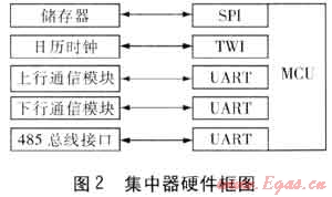 集中器的任務(wù)較多,主站抄讀實(shí)時(shí)數(shù)據(jù)時(shí)也要求集中器有一定的實(shí)時(shí)性要求,這就要求集中器中的微處理器(MCU)有較高的運(yùn)算速率。集中器的通信接口較多,要求集中器至少有3個(gè)通用異步串行接口(UART):1個(gè)UART和上行通信模塊通信,1個(gè)UART和下行通信模塊通信,另1個(gè)UART設(shè)計(jì)成RS485接口,這個(gè)RS485接口主要用于當(dāng)集中器和采集器距離很近時(shí),集中器直接通過(guò)這個(gè)RS485接口和采集器直接通信,而不需要通過(guò)下行通信模塊了。集中器內(nèi)選擇同步串行接口(SPI)的儲(chǔ)存器,它具有接線少、儲(chǔ)存量大的優(yōu)點(diǎn)。MCU需要有至少1個(gè)SPI接口。集中器做日凍結(jié)數(shù)據(jù)和月凍結(jié)數(shù)據(jù)時(shí)所需要的日歷時(shí)鐘大多采用兩線制串行接口(TWI),這就需要MCU要有TWI接口。隨著電子技術(shù)和計(jì)算機(jī)通信技術(shù)的發(fā)展,能實(shí)現(xiàn)這樣功能的MCU有很多。集中器設(shè)計(jì)時(shí)還要內(nèi)置防雷器件。集中器硬件框圖見(jiàn)圖2。