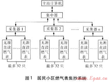 居民小區(qū)燃?xì)獗砑到y(tǒng)見(jiàn)圖1。系統(tǒng)由3部分組成,即燃?xì)獗?、集抄設(shè)備和主站。與傳統(tǒng)方式不同的是集抄設(shè)備不再是集中器一種設(shè)備,而是由集中器和采集器組成。集中器每天或每月輪抄1遍所轄的燃?xì)獗?,這個(gè)過(guò)程需要通過(guò)采集器轉(zhuǎn)發(fā)配合完成。集中器把數(shù)據(jù)保存在儲(chǔ)存器中然后等待主站發(fā)命令讀取。主站每天或每月定時(shí)讀取集中器內(nèi)的數(shù)據(jù),也可以通過(guò)集中器和采集器實(shí)時(shí)地讀取燃?xì)獗淼臄?shù)據(jù)。這個(gè)系統(tǒng)中燃?xì)獗磉x用無(wú)源直讀燃?xì)獗怼?/span>